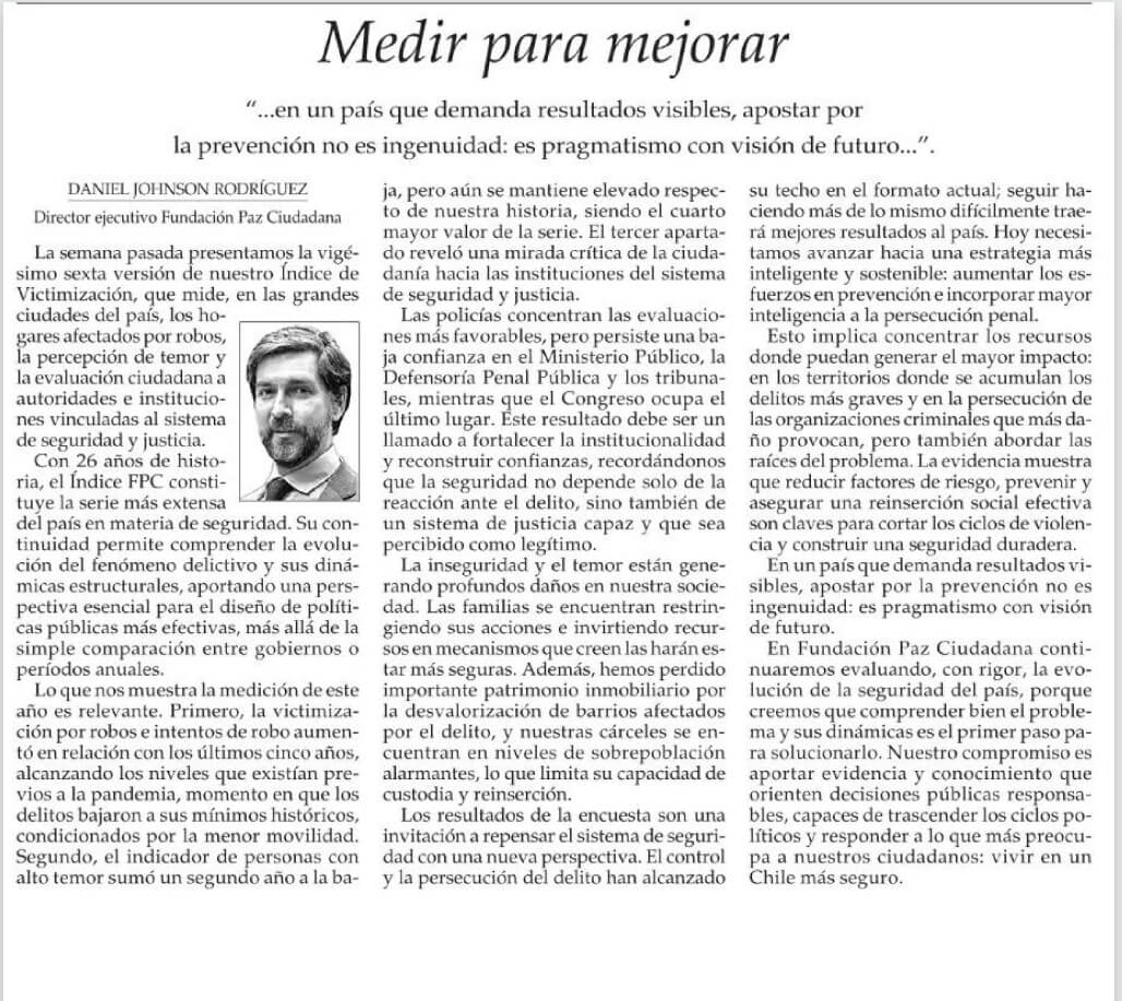 En su columna de opinión, el director ejecutivo de la Fundación, Daniel Johnson, analizó los principales resultados del informe y planteó la necesidad de avanzar hacia una estrategia de seguridad más inteligente y sostenible, basada en la prevención, la persecución penal con evidencia y la reinserción social.